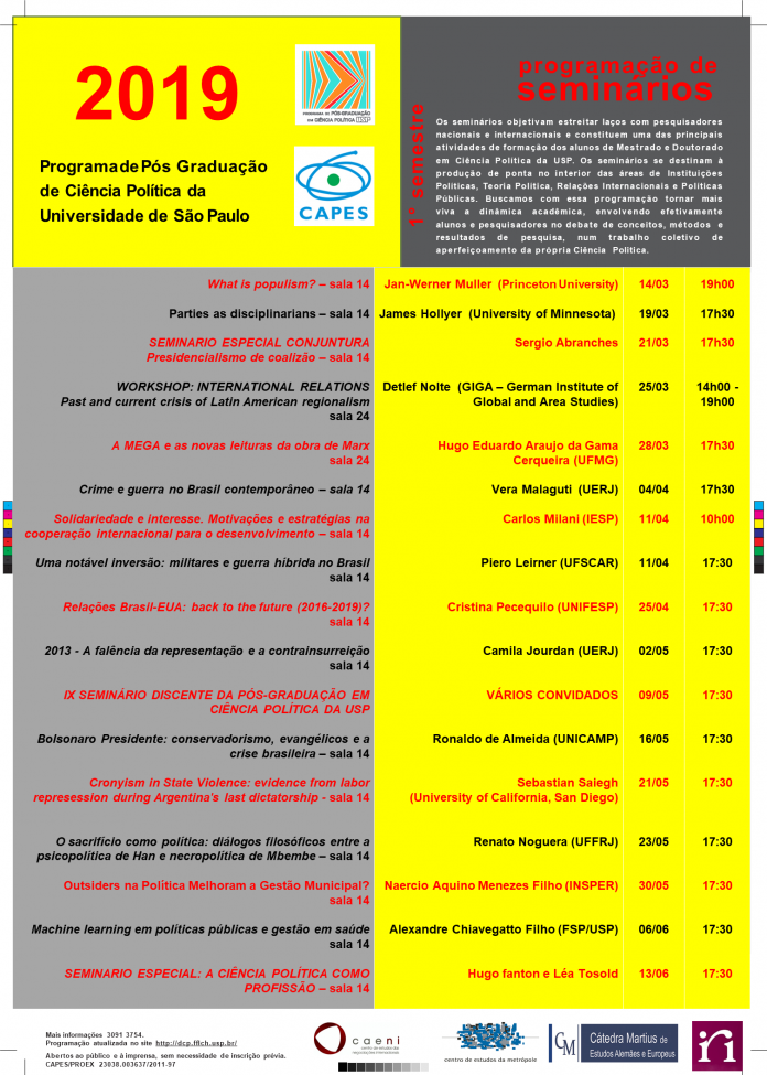 DestaquesSeminários Programação dos seminários de Ciência Política da USP 24 de março de 2019 302 Saiu a programação dos seminários de pós-graduação de Ciência Política da USP para o 1º semestre de 2019. Confira: Mais informações: 3091-3754 Subscribe To Our NewsletterJoin our mailing list to receive the latest news and updates from our team. Inscrever You have Successfully Subscribed!